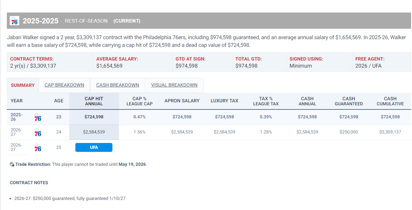在2月17日费城将沃克的双向合同转为两年的正式合同,25-26赛季仅72万美元,26-27赛季258万美元(仅保障25万)。