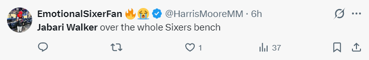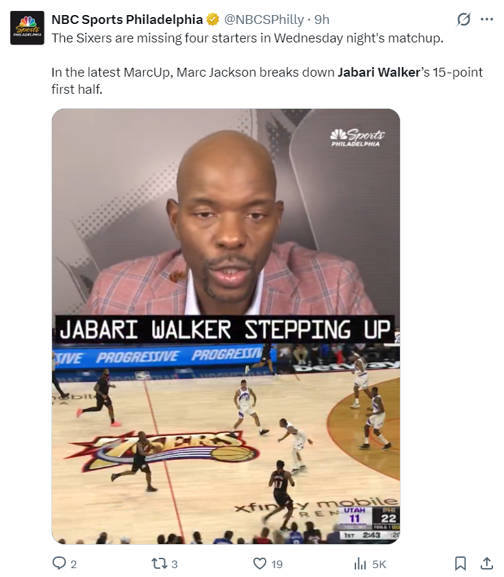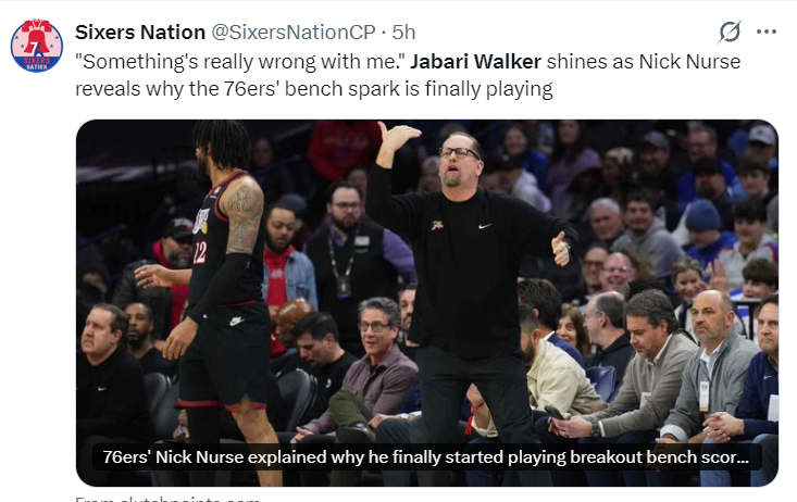 费城记者:贾巴里-沃克在整个费城76人队的替补席上占据着重要位置。