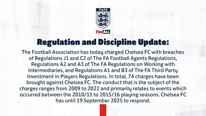 英足总今日指控切尔西俱乐部违反了《英足总足球经纪人条例》的J1和C2条款、《英足总中介合作条例》的A2和A3条款以及《英足总球员第三方投资条例》的A1和B3条款。